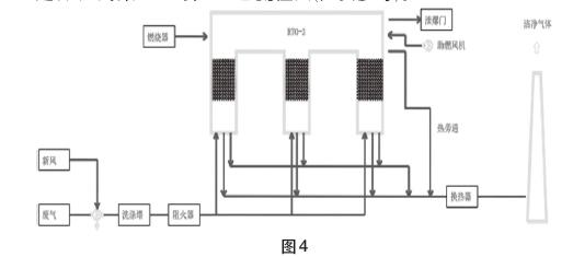 在廢氣處理項(xiàng)目中,3塔RTO一般與風(fēng)機(jī),噴淋塔,阻火器,煙囪等組成一個(gè)系統(tǒng)。RTO一般正壓運(yùn)行,風(fēng)機(jī)應(yīng)選擇變頻控制適應(yīng)不同工況。前置噴淋塔可吸收酸、堿性廢氣,減少對(duì)RTO爐的腐蝕。后置噴淋塔可進(jìn)一步降低廢氣排放量。有的有熱回收需求,可在末端增設(shè)熱交換器,產(chǎn)生熱水和熱氣回用。煙囪可根據(jù)項(xiàng)目需要設(shè)計(jì),一般至少為15米高,煙囪越高對(duì)廢氣擴(kuò)散有利,成本也越高。系統(tǒng)的組成需要根據(jù)項(xiàng)目來設(shè)定,圖4為某RTO項(xiàng)目工藝流程圖(供參考)。