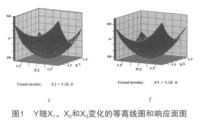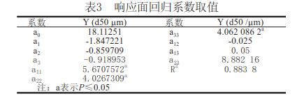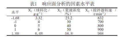 利用響應面分析法[1]化枸杞子渣超微粉碎工藝參數(shù)。在單因素預試驗基礎上,用SAS軟件系統(tǒng)進行響應面分析,設計一個三因素五水平的回歸方程來擬合因素和指標(響應值)之間的函數(shù)關系。選擇球料比(X1)、枸杞子渣漿液濃度(X2)和攪拌器轉(zhuǎn)速(X3)作為因素,以粉碎后的顆粒粒度d50作為響應值對球磨機濕法超微粉碎工藝進行化。