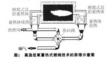 通過(guò)蓄熱式燃燒原理可知.常溫空氣是用高壓風(fēng)機(jī)由四通換向閥切換進(jìn)入預(yù)熱器后在短時(shí)間內(nèi)被加熱到700℃左右,熱空氣進(jìn)入爐膛后,抽吸周?chē)脱鯛t氣,從而形成含氧量低于21%(一般在15%)的低氧高溫空氣。然后再與空氣噴嘴附近噴入的燃料混合燃燒。
