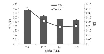2.1.3研磨時(shí)間的篩選稱取BRE原料藥7.5g,置于含有吐溫80(1.125g)的水溶液(22.5mL)中,攪拌混懸,加入氧化鋯珠(粒徑為0.6mm)450g,分別研磨0.5、0.75、1.0、1.5h,制備3批BRE納米晶混懸液。以BRE納米晶混懸液的粒徑、PDI為指標(biāo),篩選研磨時(shí)間。結(jié)果,隨著研磨時(shí)間的延長(zhǎng),BRE納米晶混懸液的粒徑、PDI逐漸減小;研磨0.5、0.75、1.0h時(shí),BRE納米晶混懸液的粒徑、PDI減小的幅度較大;研磨1.5h時(shí),BRE納米晶混懸液粒徑雖然較研磨1.0h時(shí)的粒徑減小,但減小幅度不大。綜合考慮能耗和時(shí)間,確定研磨時(shí)間為1h。研磨時(shí)間的篩選結(jié)果見(jiàn)圖3。